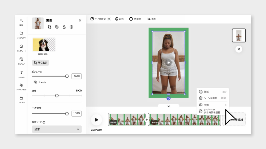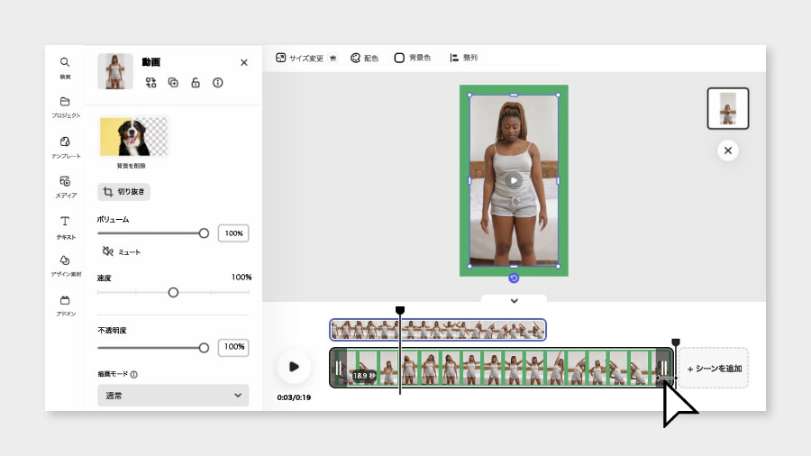 シーンを少し編集するだけで、ビデオが大きく変わることがあります。Adobe Expressを使えば、不要なシーンをカットしてビデオを希望の長さにするのも簡単です。個々のシーンを調整して、ビデオ全体のスタイルとペースを調整することもできます。
