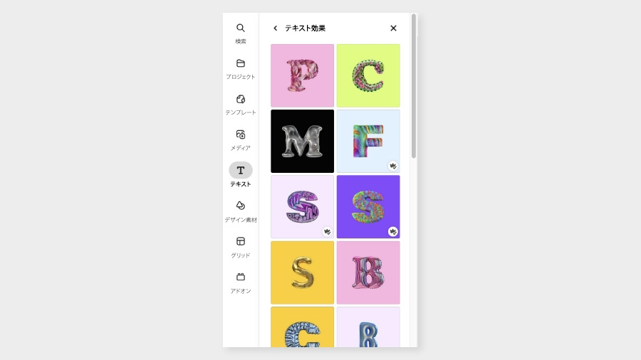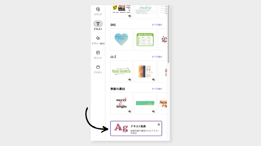 テキスト効果のサンプルの一覧にイメージに合ったものがなくても心配ありません。左側のフォントオプションのいずれかをクリックして、独自のテキスト効果を作成しましょう。