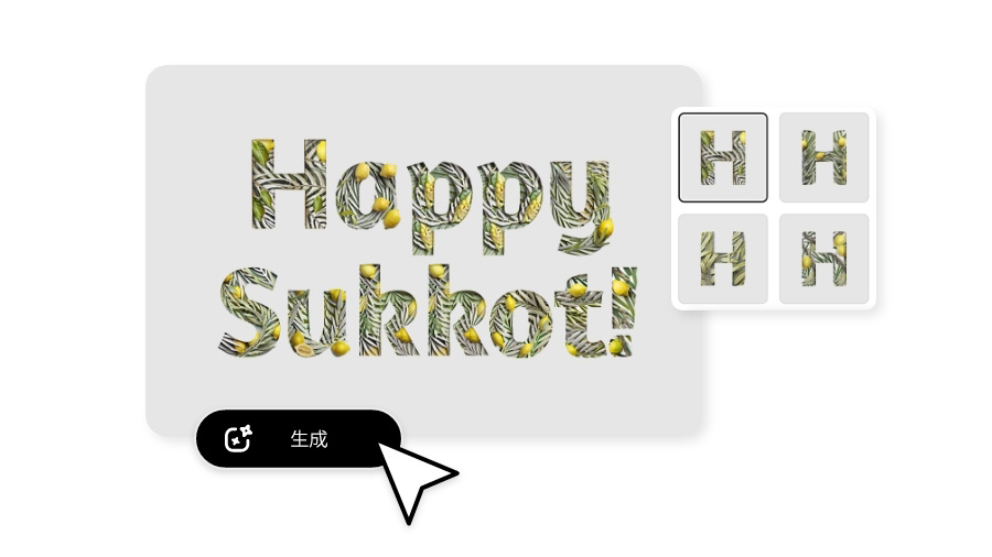 例えば、「セージ色のヤシの葉、柳の枝、繊細なひだのあるテクスチャの紙で作られたカットされていない丸ごとのレモンを編み込んだもの」というテキスト効果プロンプトを使用して生成されるこちらの例は、収穫祭のイメージを膨らませ、それを祝うカードの叩き台として最適です。