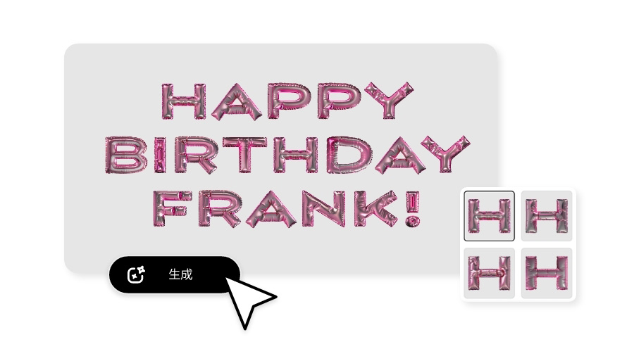 バースデーカードに非日常感あふれるディテールと独創性を盛り込むことで、友人や家族をあっと驚かせましょう。電球も悪くないのですが、メタリックカラーの風船で名前を書くとよりかっこよくなります。雰囲気に合わせて以下の例をベースとして使用し、目を引くように少し手を加えます。次に、Fireflyで「ピンクのメタリックカラーの紐付きのマイラー樹脂製の風船」のようなテキスト効果プロンプトを使用して豪華に仕上げ、Adobe Expressに取り込んで他にはないオリジナルのバースデーカードを仕上げます。