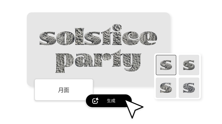 FireflyのAIテキスト効果を使用して、パーティーのテーマに合わせて招待状を簡単にカスタマイズできます。また、AIテキスト効果を使用して、こちらの月をテーマにした旧暦の至点を祝うパーティの招待状のように、招待状に楽しくきらびやかな雰囲気を足すことができます。以下の例をもとに、Fireflyで月面の簡単なプロンプトでテキスト効果を作成したらAdobe Expressに移動します。