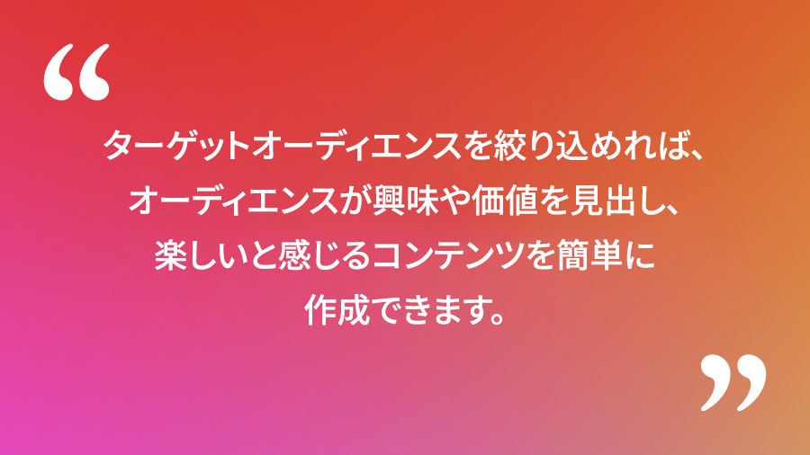 言うまでもありませんが、コンテンツの再生回数を増やす一番の方法は、単純に人々が心から見たいと思うすばらしいコンテンツを作成することです。ターゲットオーディエンスのことが理解できていれば、オーディエンスが魅力的で、価値があり、楽しいと感じるコンテンツを作成するのは簡単です。ブランドを構築したいと考えている人にとって重要なことは、オーディエンスと本当につながり、あなたのことがもっとわかるようなコンテンツを作成するとともに、オーディエンスが最も興味を持っているトピックに関する意見交換を楽しむことです。どのようなコンテンツを作成すればよいかわからない場合は、解析データをチェックして既存のコンテンツの反応を確認したり、市場調査をおこなったりしましょう。