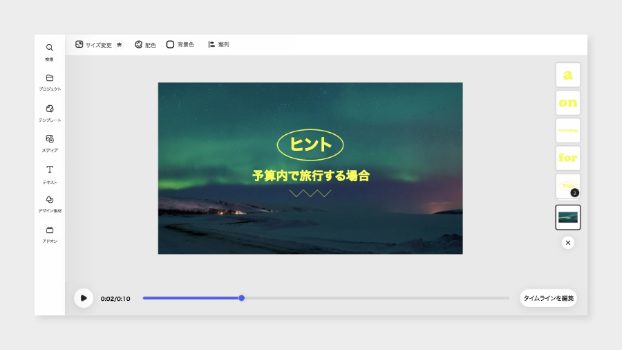 速度を上げたビデオにタイムラインの長さを合わせるには、タイムラインの端をドラッグして、レイヤーと長さを揃えます。
