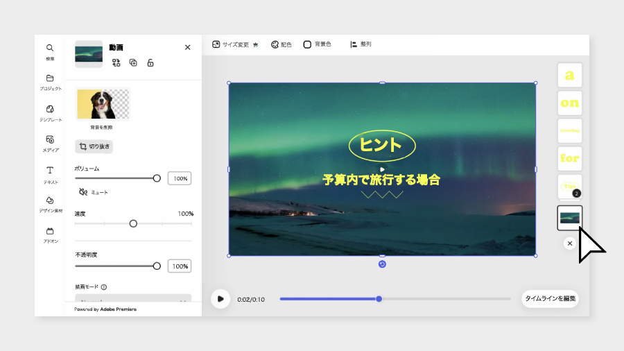 エディターに動画が表示されたら、カンバス上でそれを選択します。カンバス上に複数のオブジェクトがある場合は、右上のナビゲーションメニューでレイヤースタックをクリックして簡単に目的の動画を選択できます。動画レイヤーを選択すると、プロパティパネルと動画編集用のコントロールが表示されます。動画レイヤーが選択されていない場合はプロパティパネルが非表示になります。ビデオの周囲に選択を示す線が表示されていることを確認してください。