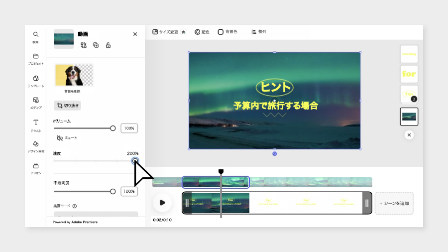 プロパティパネルを使用して動画を遅くすることもできます。動画の速度を下げると、長くなったシーンのデュレーションを収めるためにクリップの一部がカットされる場合があります。動画全体を表示するには、単純に、ハンドルを使ってシーンの長さを延ばします。
