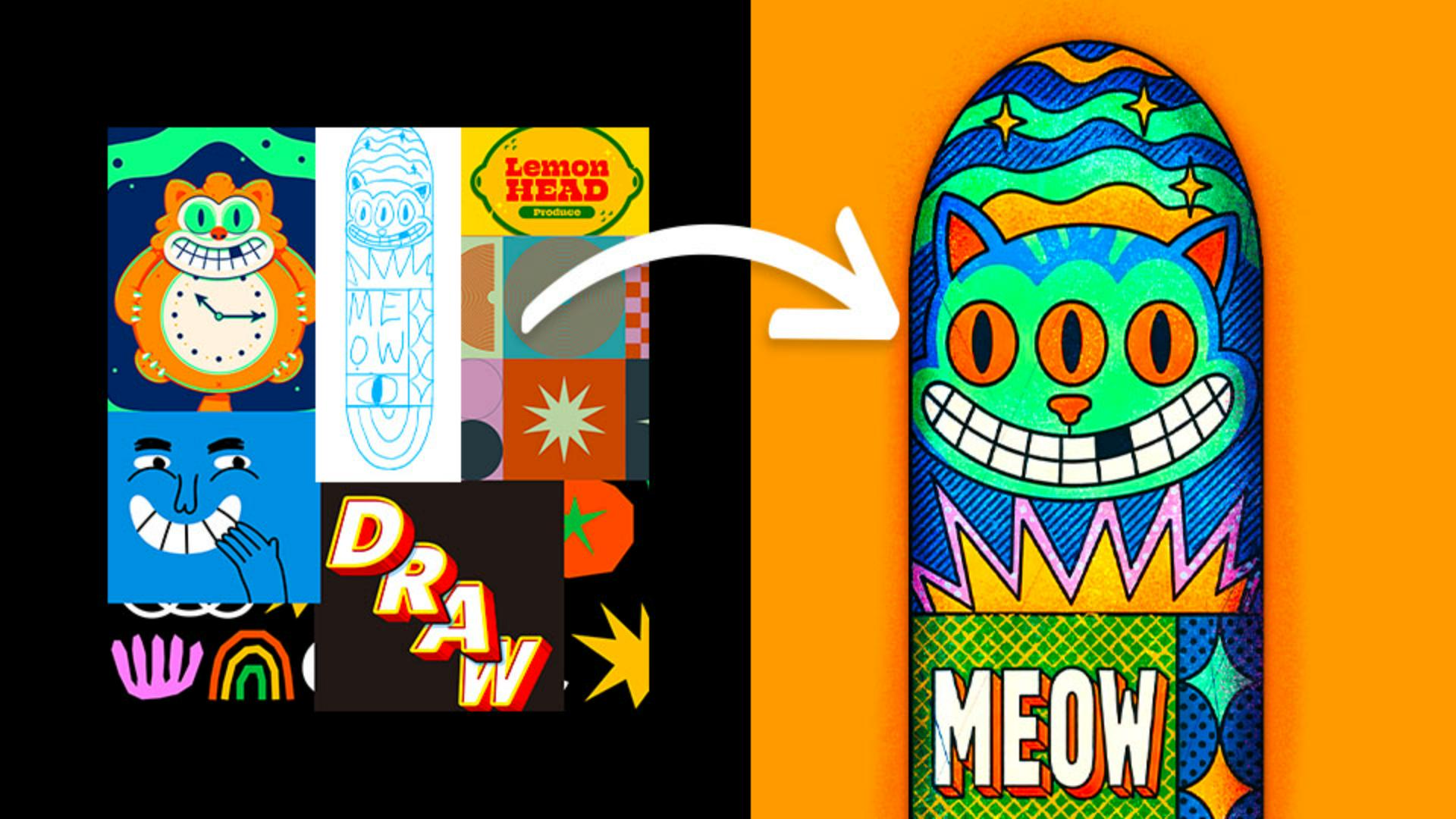 スケートボードのカスタムグラフィックの 作成に役立つ方法を、 ムードボードの作成から 複数のコンセプトのアイデア出し、 それらのアイデアをPhotoshopに読み込んで 仕上げを始めるところまで説明します。