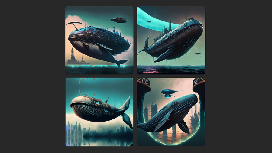 画⾯下に表⽰されるテキストボックスに、⽣成したい画像を説明するプロンプトを⼊⼒します。ここでは「鯨の⾶⾏船、サイバーパンク、リアル、スチーム」と⼊⼒し、「⽣成」ボタンをクリックします。