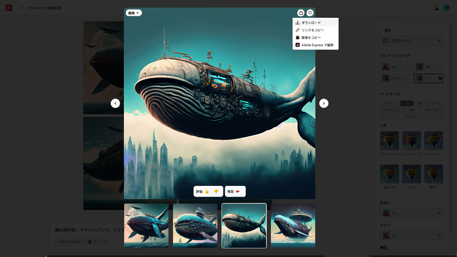 思い通りの画像が⽣成されたら、その画像を選択し、右上の「その他のオプション」アイコンをクリックします。「ダウンロード」を選択すると、コンテンツ認証情報が適⽤された画像がダウンロードされます。