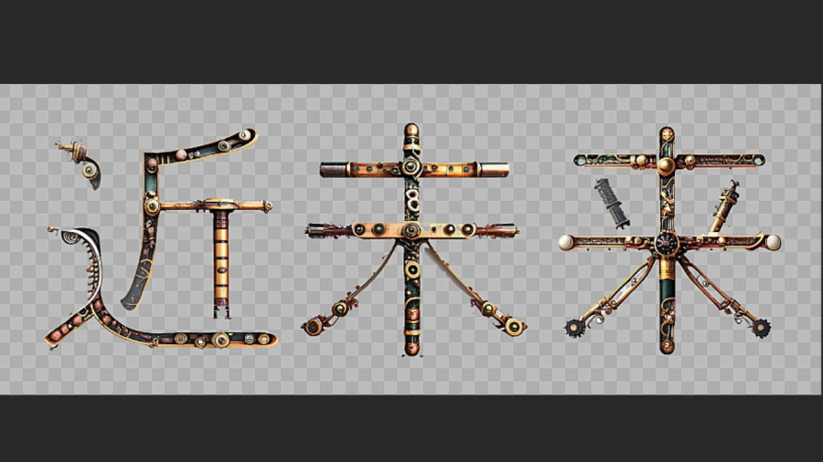 テキストにスチームパンクをイメージする装飾が適⽤されます。4つの候補のサムネールをそれぞれクリックすると、拡⼤して表⽰されます。