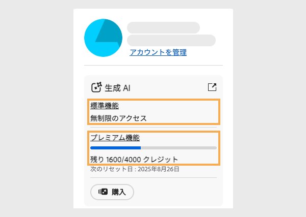 標準機能とプレミアム機能それぞれの残り生成クレジット数に加えて、契約中のプランに含まれる生成クレジット数も表示されます。上の図は、標準機能は無制限に利用可能、プレミアム機能はプランに含まれるクレジットが 4000 で、残り 1600 が利用可能であることを示しています。