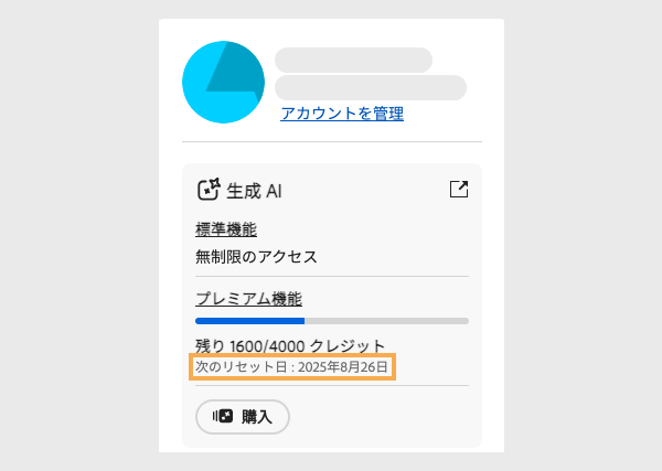 リセットの際、保有している生成クレジットは繰り越されませんが、利用中のプランに応じて、新たに生成クレジットが割り当てられます。リセットのタイミングは、以下のように、残りクレジットの下に表示されます。