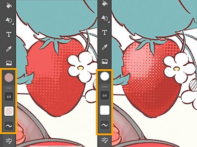 ツールバーでブラシの色を落ち着いたピンク色に調整し、サイズを「64」に設定します。筆圧でドットパターンの大きさを調整しながら苺を塗っていきます。濃い色を塗り足したり、不透明度を調整したりして立体感を出していきます。