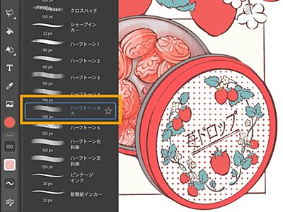 缶の蓋の下絵レイヤーの上に新規レイヤーを追加し、クリッピングマスクを作成します。ツールバーの「ブラシ」から「ピクセルブラシ>コミック>ハーフトーン4大」を選択し、缶の蓋の白い部分を塗ると、領域をはみ出さずにドットパターンが追加されます。