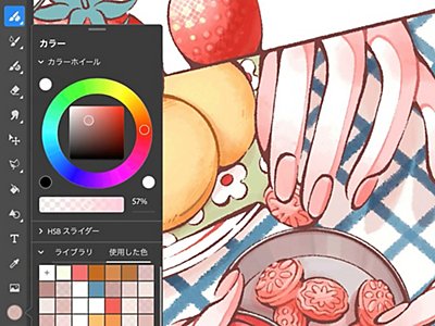 次に、ツールバーの「ブラシ」をタップして、「ピクセルブラシ>ペイント>ナチュラルブラシ 1」を選択し、カラーをくすんだピンクに設定します。皿や手の下に影を追加していきます。