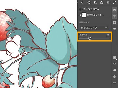下塗りの上からブラシで塗り足し、「レイヤープロパティ」で不透明度を調整しながら陰影をつけていきます。
