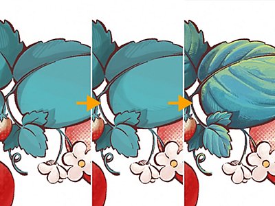 さらに新規レイヤーを追加し、ブラシの種類やカラー、レイヤープロパティを調整しながら、葉のディテールを描き込んで仕上げていきます。
