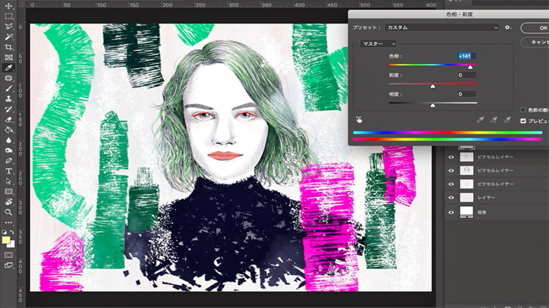 Frescoで描いたイラストは「クラウドドキュメント」にpsd形式で自動保存され、Photoshopと簡単に連携することができます。最後にPhotoshopでイラストを開き、色の変更やレイヤーの調整をおこなって仕上げていきます。