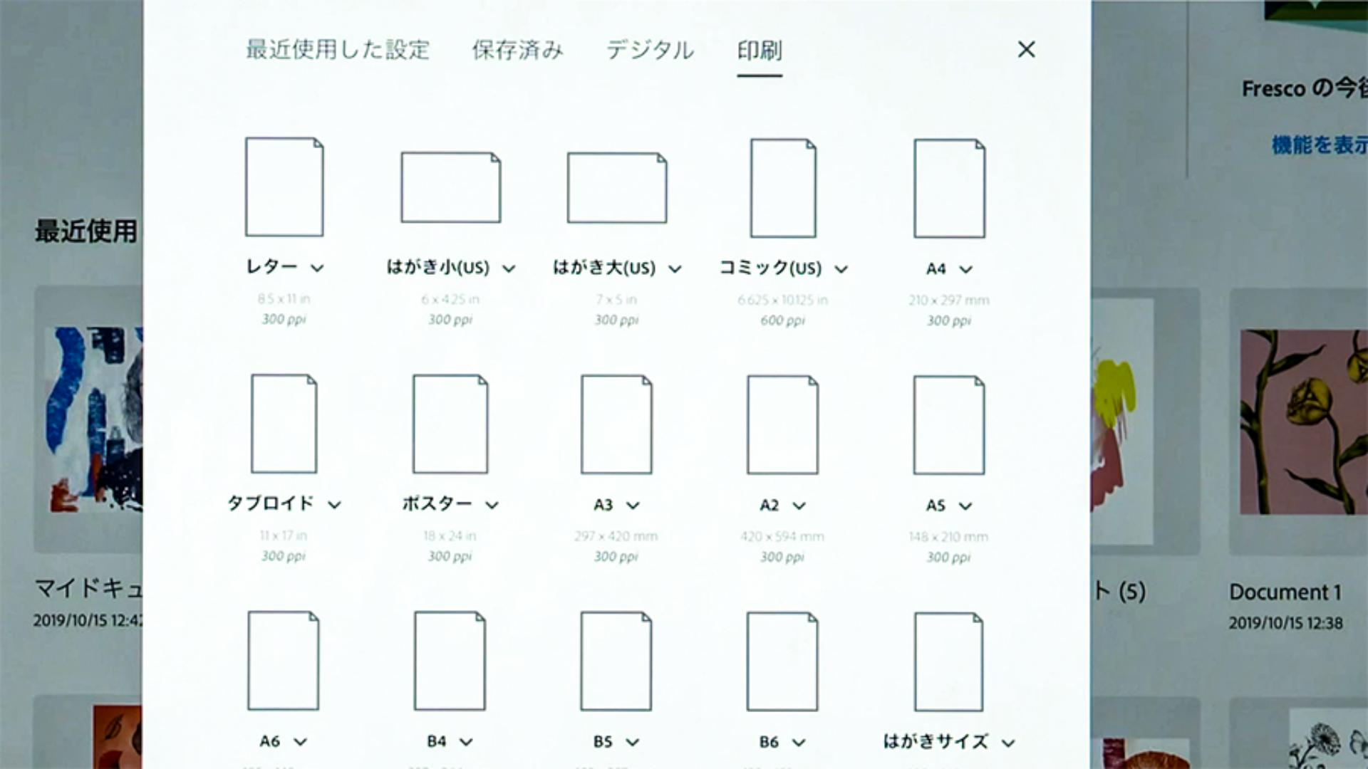 Frescoを起動し、ホーム画面から新規ドキュメントを作成します。プリセットとして用意されたデジタル用または印刷用レイアウトを選択するか、独自のカスタムサイズを設定しましょう。空白のキャンバスが開いたら、ツールバーやレイヤーパネルなどFrescoの作業画面(ワークスペース)を見ていきます。