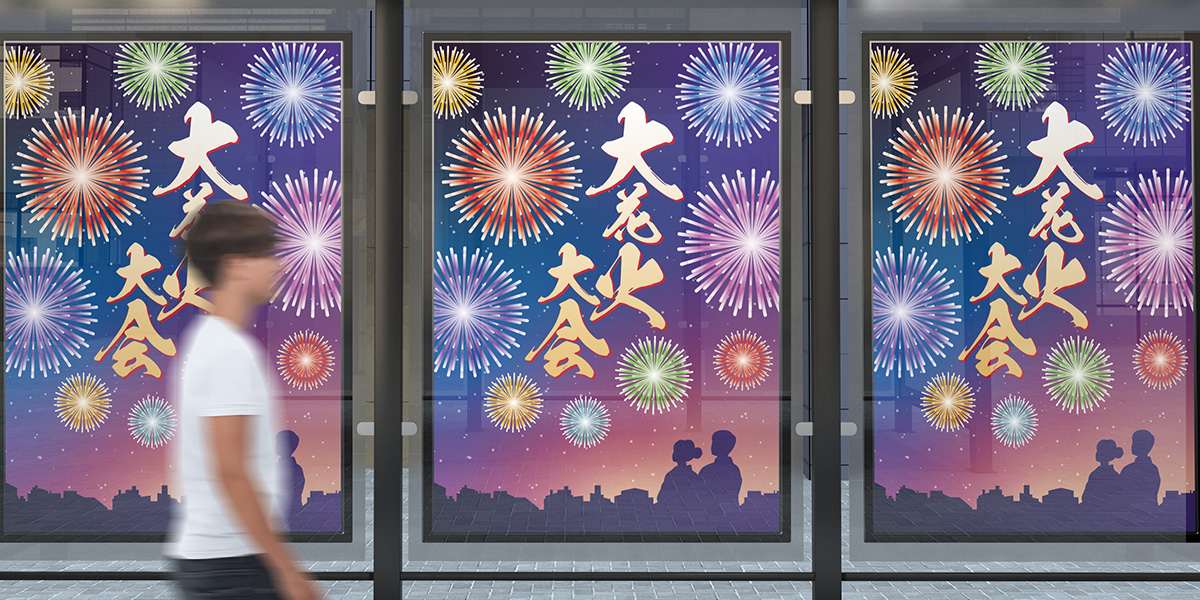 花火大会のポスターを作成します。構成は大きく分けて4つ、「フリーグラデーションでマジックアワーの夜空」「散布ブラシで星」「リピートラジアルで花火」「オブジェクトの再配色で花火のカラーバリエーション」となります。