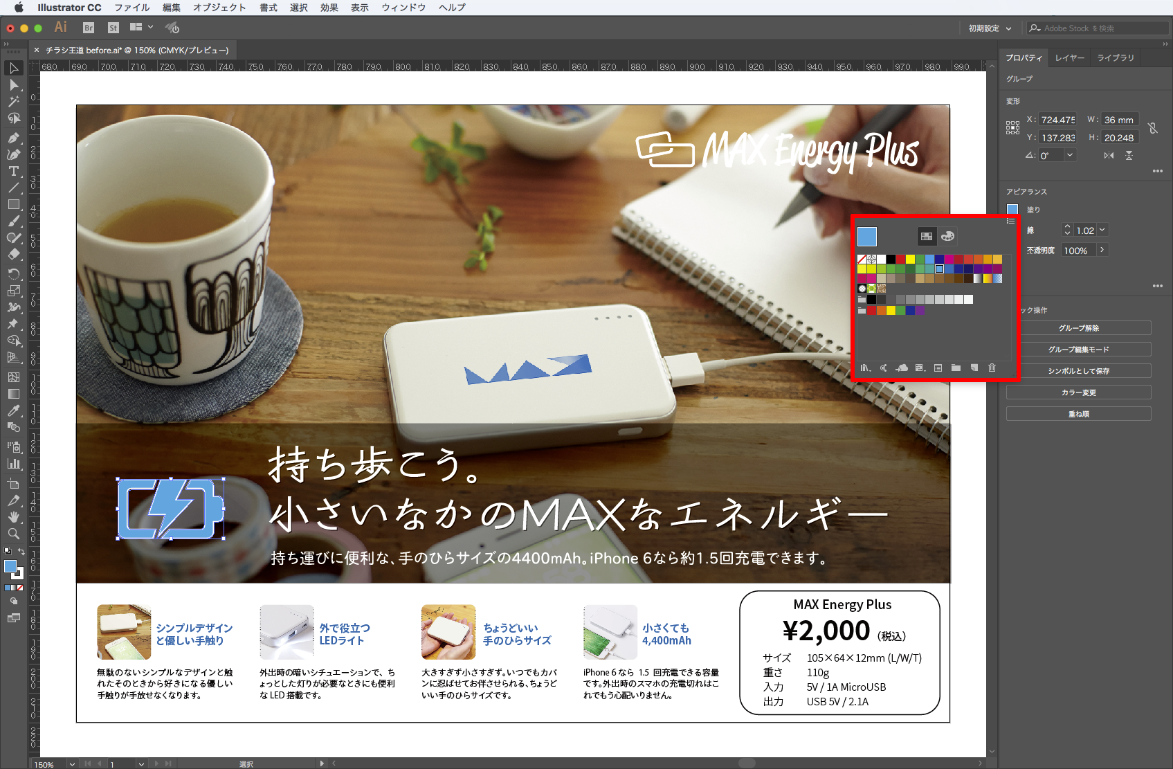 3. イラストが選択されている状態で、プロパティパネルの[塗り]をクリックし色を変更します。