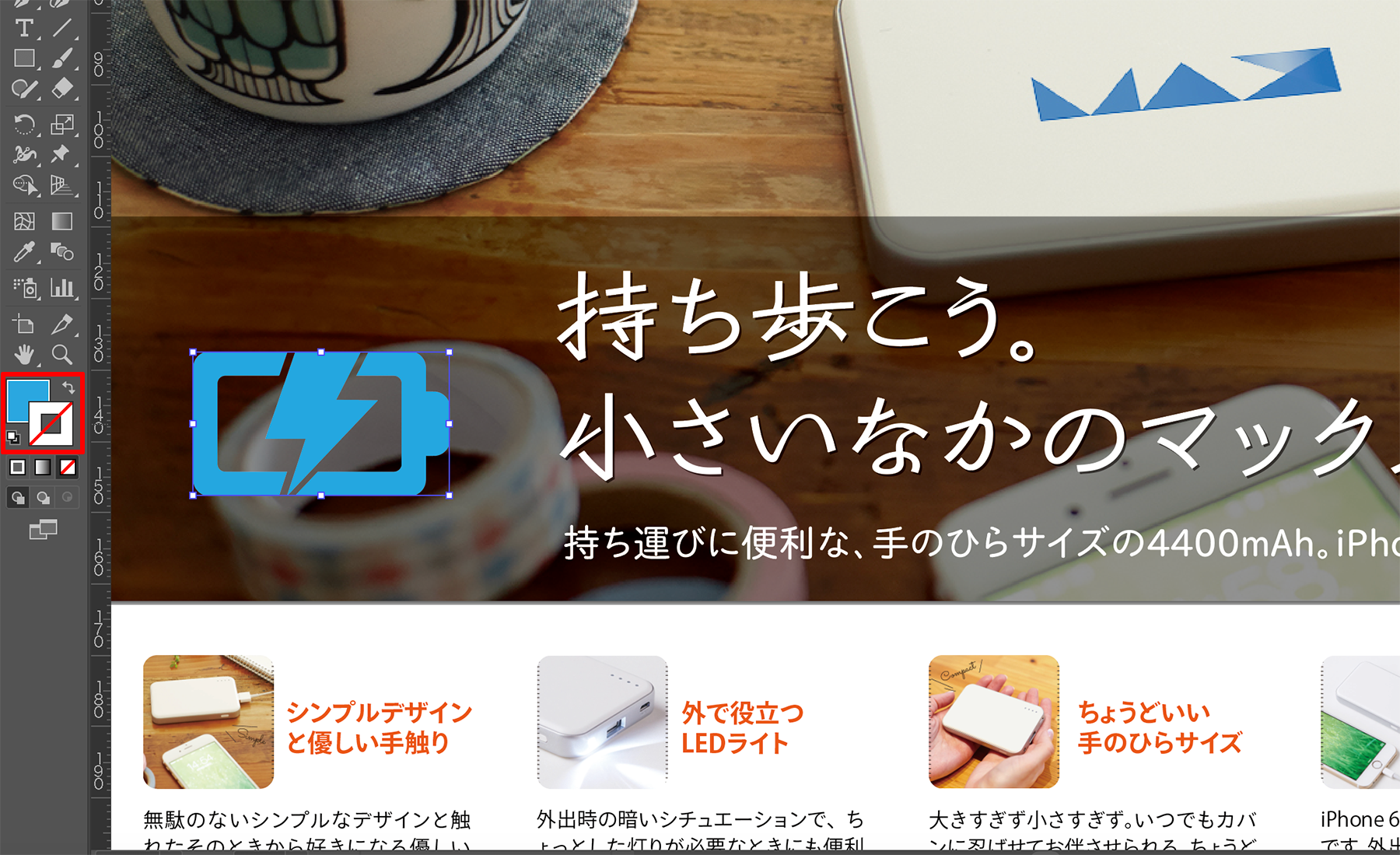 2. ここでは充電アイコンの色を変更したいので、ツールパネルから[選択ツール]を選び、充電アイコンのイラストをクリックして選択します。