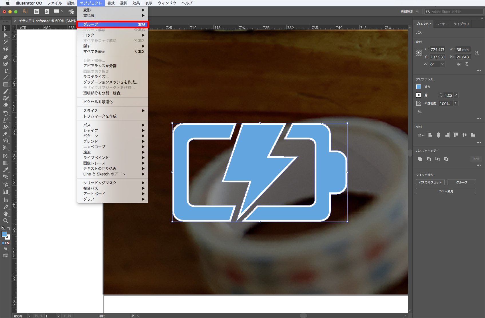 グループ化されたイラストをダブルクリックすると編集モードへ切り替わり、グループ解除をすることなく、グループの中を個別に編集することができます。充電アイコンの真ん中、稲妻部分をダブルクリックすると、稲妻部分の色だけを変更することができます。