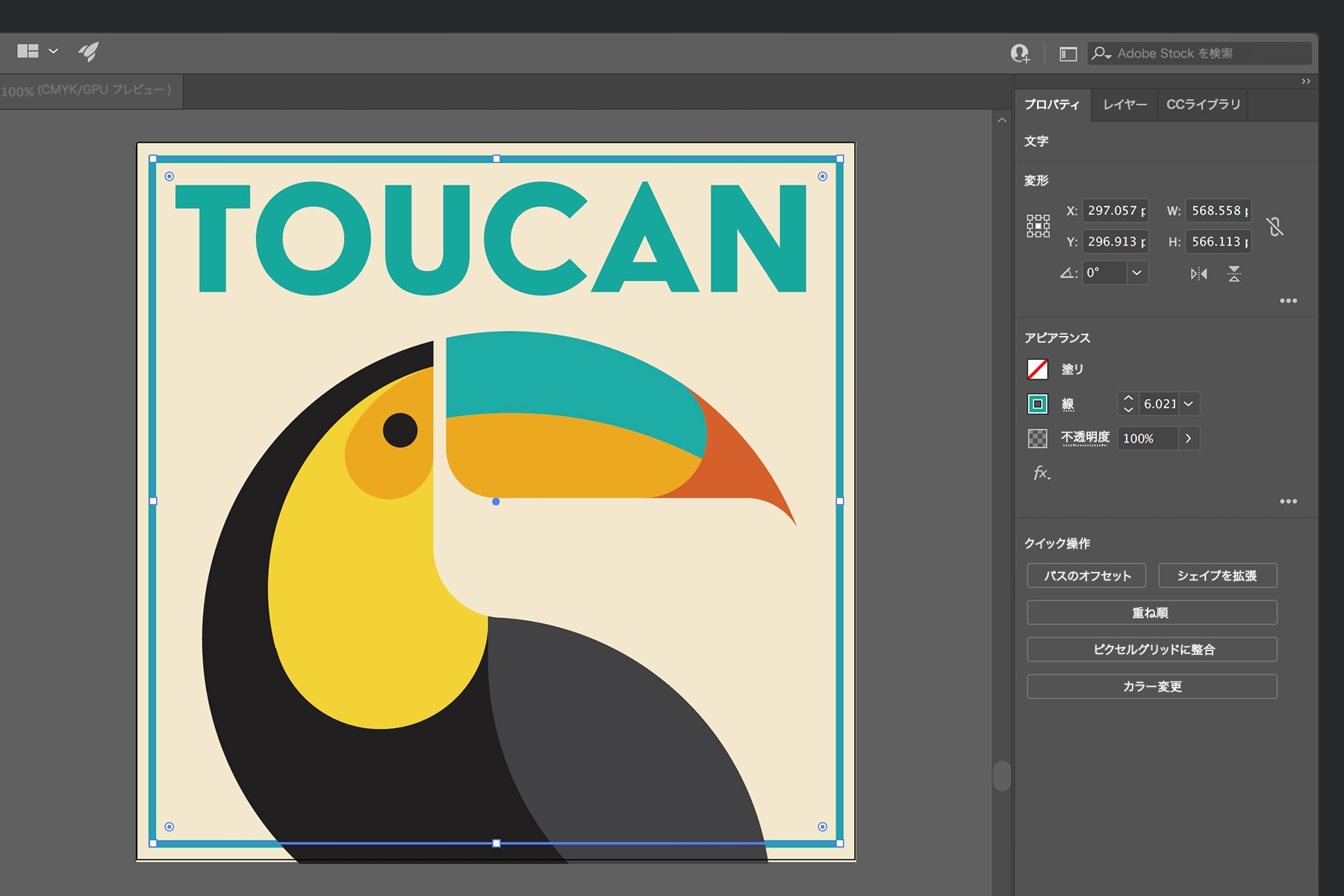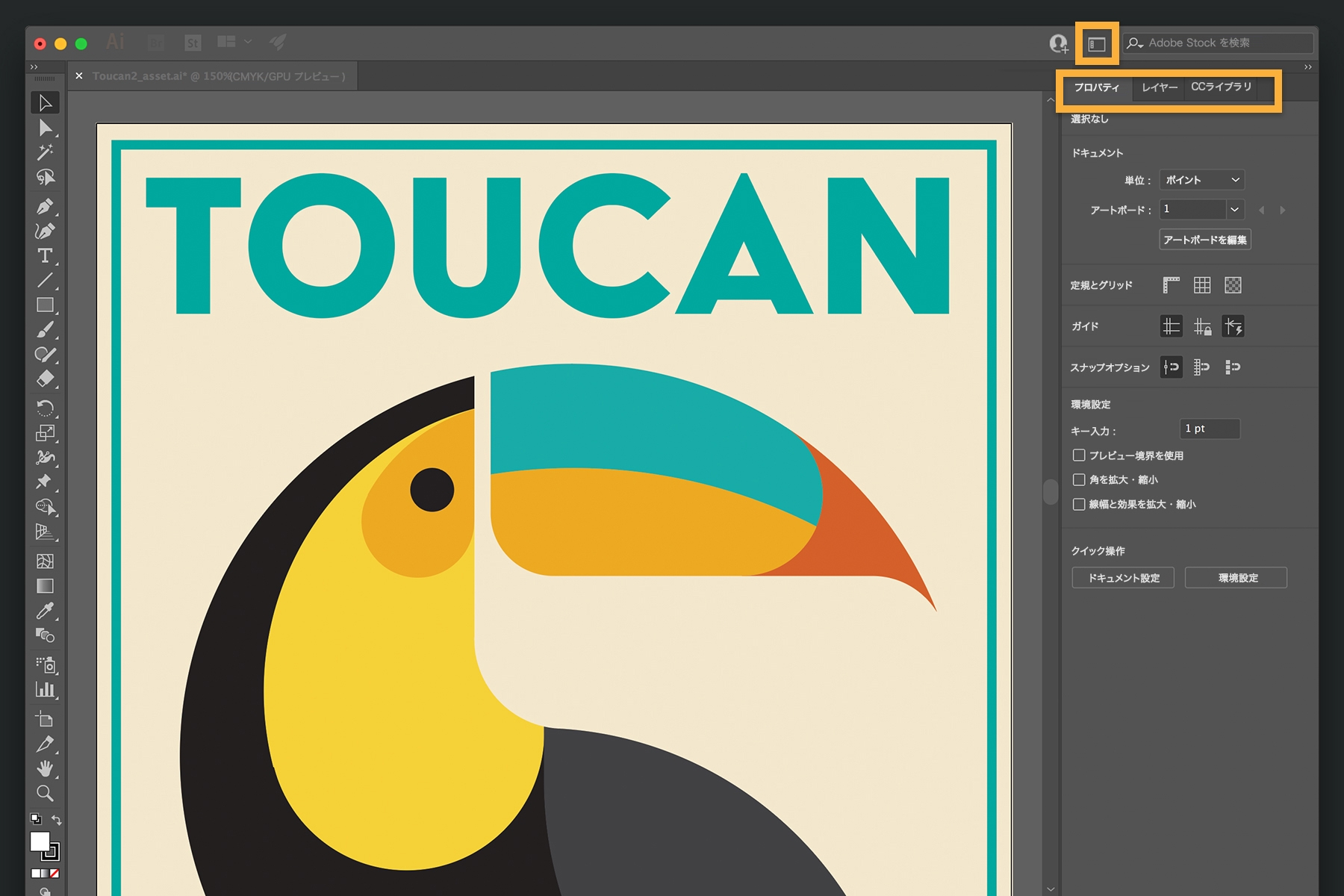 左側のツールパネルで使用するツールを選択し、中央のアートボードでアートワークを作成します。右側には、プロパティ、レイヤー、ライブラリの3つのパネルがドッキングされています。3つのパネルでは、もっともよく使用する項目や機能に簡単にアクセスできます。