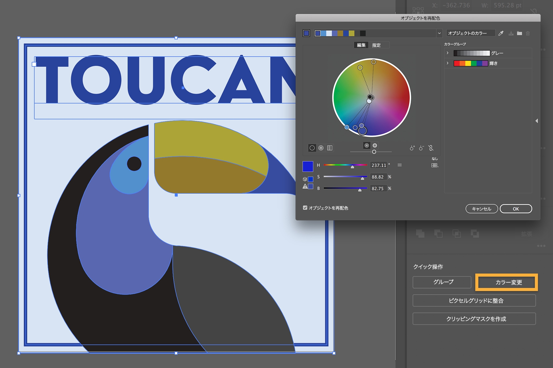 「クイック操作」セクションでは、よく使用する多くの操作に容易にアクセスできます。例えば、複数のオブジェクトを選択した場合は、「グループ」を選択できます。また、「オブジェクトを再配色」を選択すれば、色の調和を維持しながら、すばやくカラーを変更できます。パスファインダー機能を使って、重なったオブジェクトからユニークな複合シェイプを作成したり、整列機能を使って選択したオブジェクトをさまざまな方法で整列させることができます。