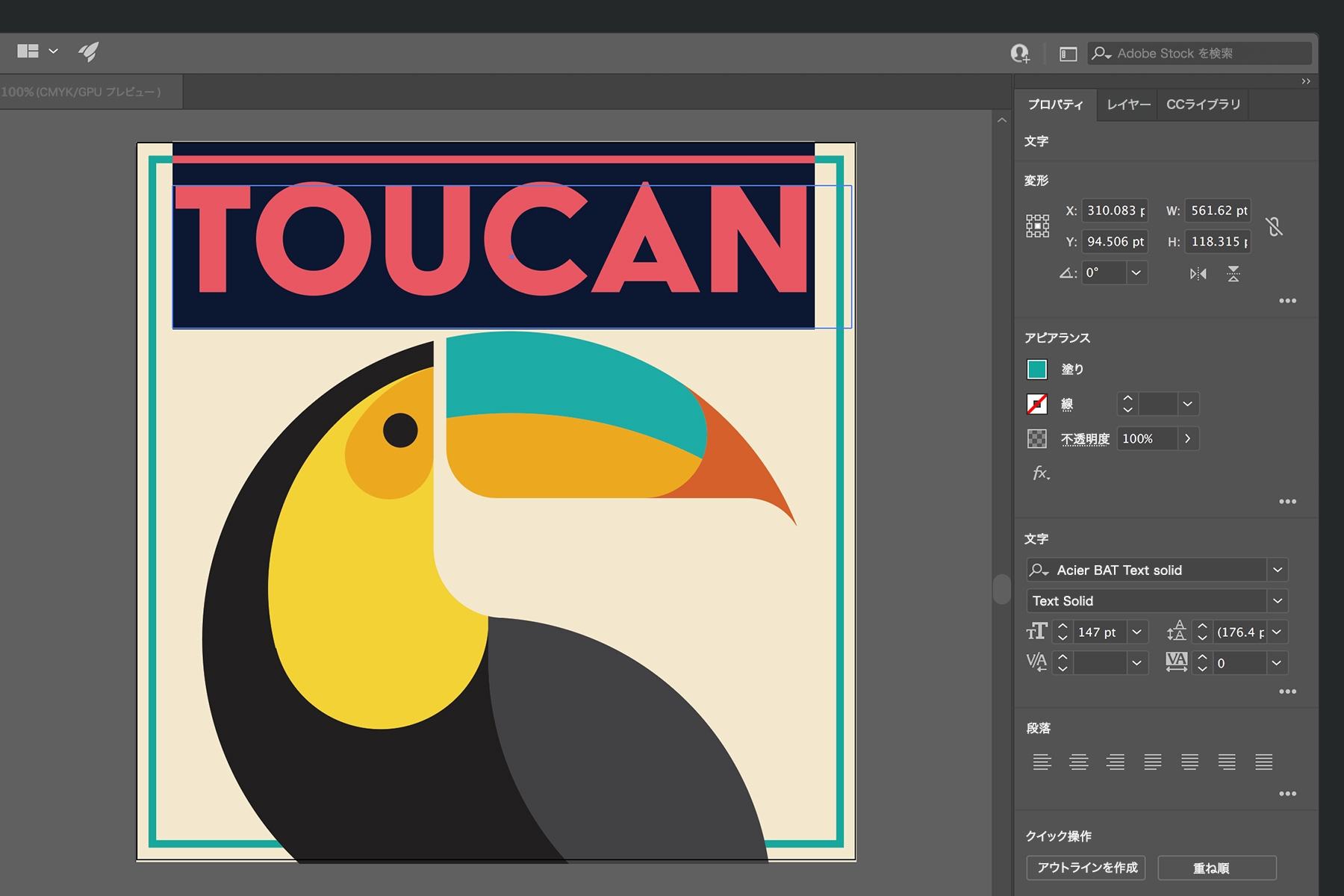 テキストを選択すれば、簡単にフォント、スタイル、その他の文字属性を変更でき、さらにサイズ、縦横比、回転角度などを変更して、テキストオブジェクトを完全にコントロールできます。テキストにカラーを適用し、不透明度を変更し(透明度を高く)、その他の効果も加えてみましょう。「アウトラインを作成」をクリックすれば、テキストがシェイプに変換され、クリエイティブな作業が可能となります。