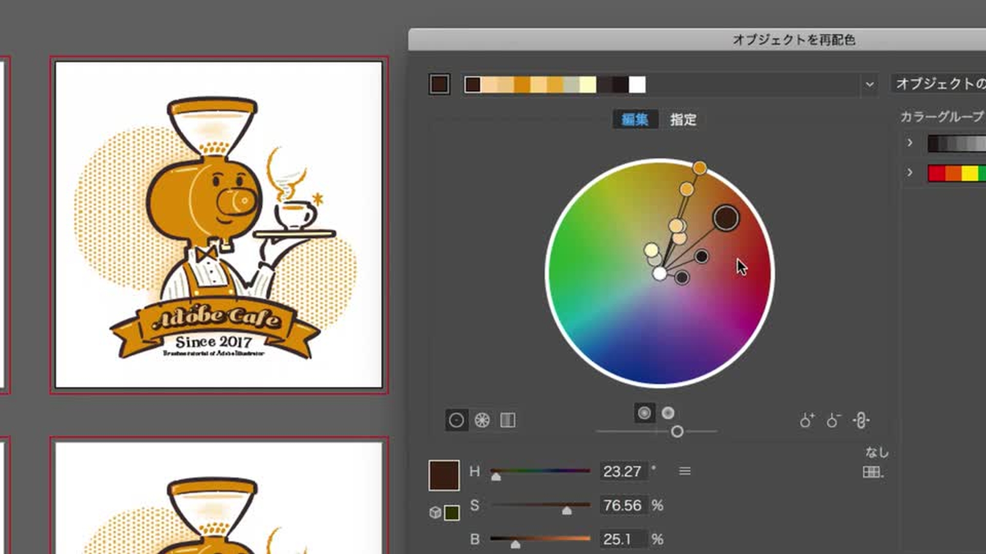 複製したアートボードのイラストを「選択ツール」ですべて選択し、コントロールバーの「オブジェクトを再配色」をクリックしてダイアログボックスを表示させます。