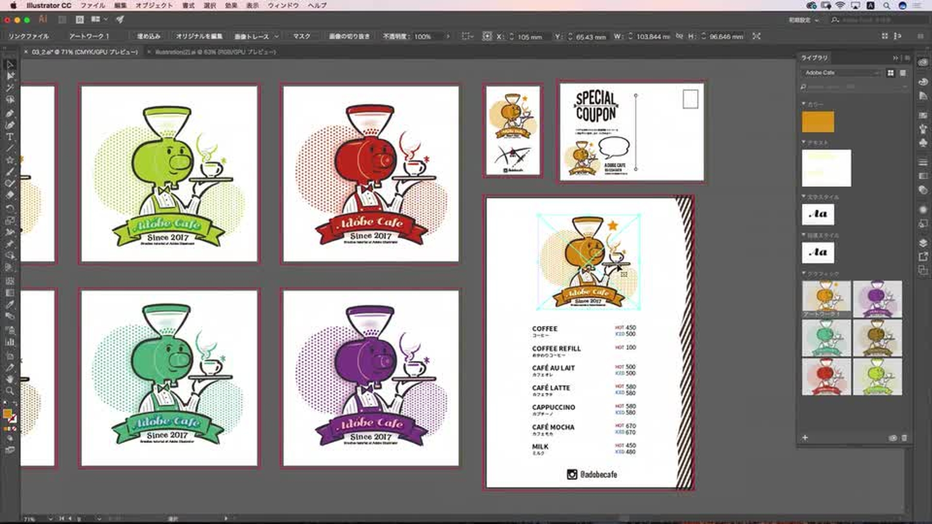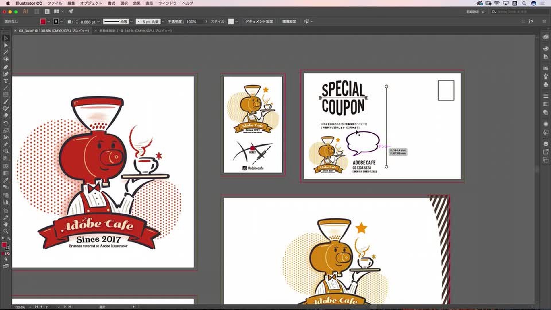 Illustratorは、その名の通りイラストを描くことを得意とするツールです。ブラシツールを使えば、紙に描くような感覚で自由にイラストを描くことができます。このチュートリアルでは、カフェのシンボルマークをイラストで作成し、ショップカードやDM、メニューなどに効率よく展開していく方法をご紹介します。