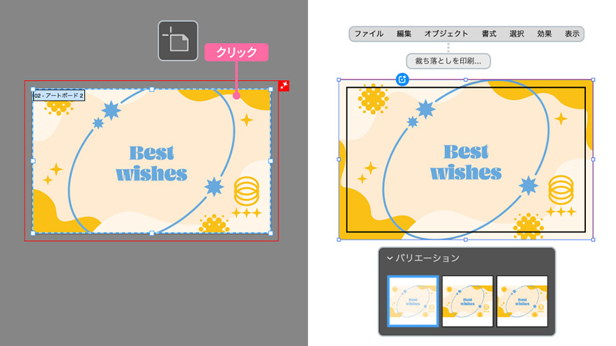 「オブジェクト」メニュー>「裁ち落としを印刷」を実行