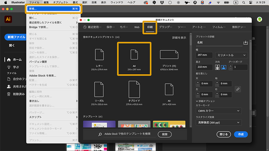 まずは、印刷物に適した形式で新しいドキュメントを作成します。メニューから ファイル/新規 を選択すると、 新規ドキュメント ダイアログボックスが表示されます。タブから「 印刷 」を選び、「 空のドキュメントプリセット 」から「 A4 」を選択します。