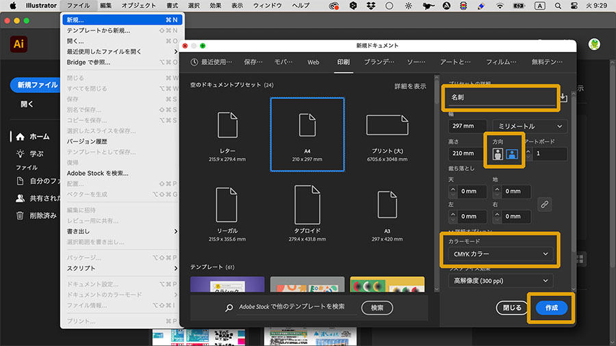 次に「 プリセットの詳細 」に「名刺」と入力し、カラーモードが「CMYKカラー」になっていることを確認します。最後に「 方向 」を「横」に設定し、「 作成 」をクリックすれば準備完了です。