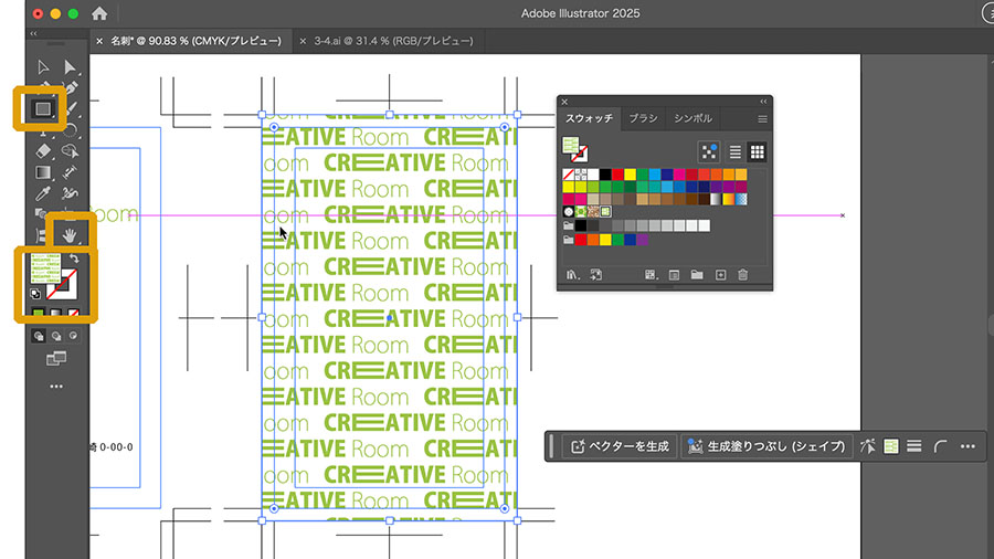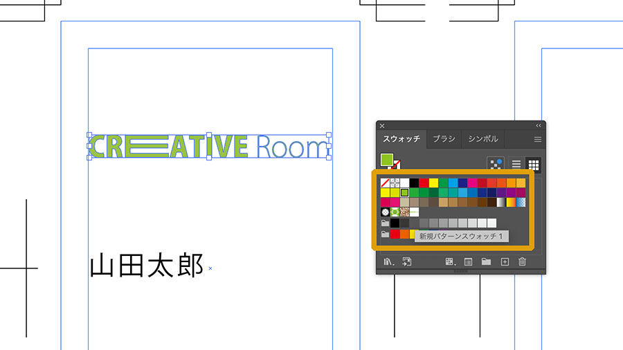 選択 ツールでロゴを スウォッチ パネルにドラッグ&ドロップすると、「新規パターンスウォッチ1」として登録されます。アートボードの空白部分をクリックしてロゴの選択を解除します。