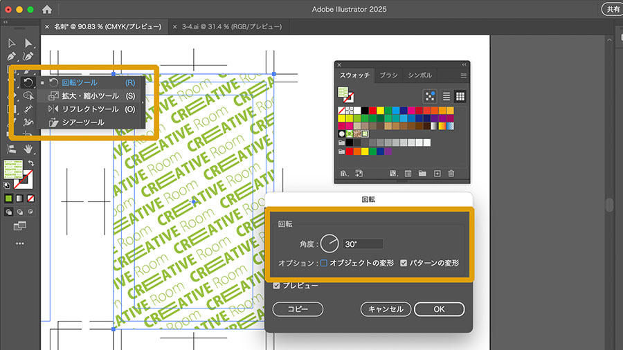 背景の角度を変える場合は、 回転 ツールをダブルクリックし、「 角度 」を「30°」に設定します。「オブジェクトの変形」のチェックは外し、「パターンの変形」にチェックを入れて「 OK 」をクリックします。