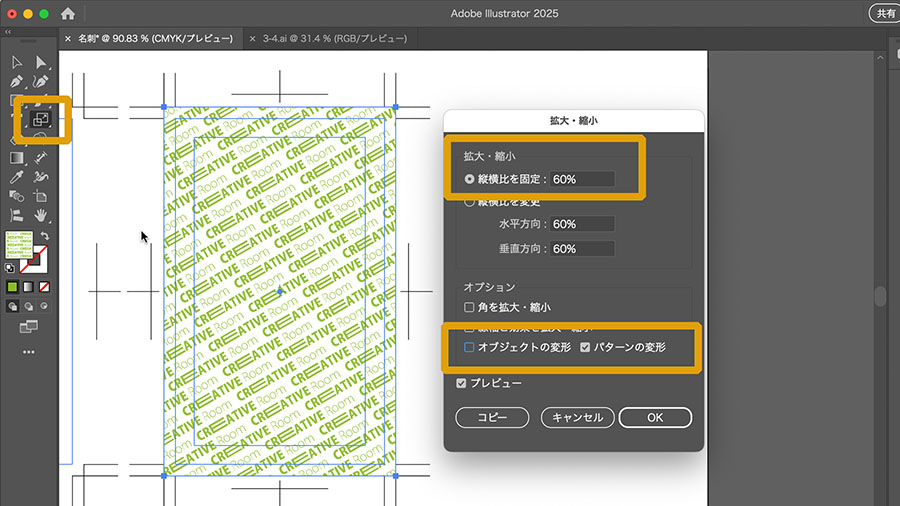 柄の大きさを変える場合は、 拡大・縮小 ツールをダブルクリックします。「縦横比を固定」にチェックを入れて「60%」に設定し、「オブジェクトの変形」のチェックを外し、「パターンの変形」にチェックを入れて「 OK 」をクリックします。