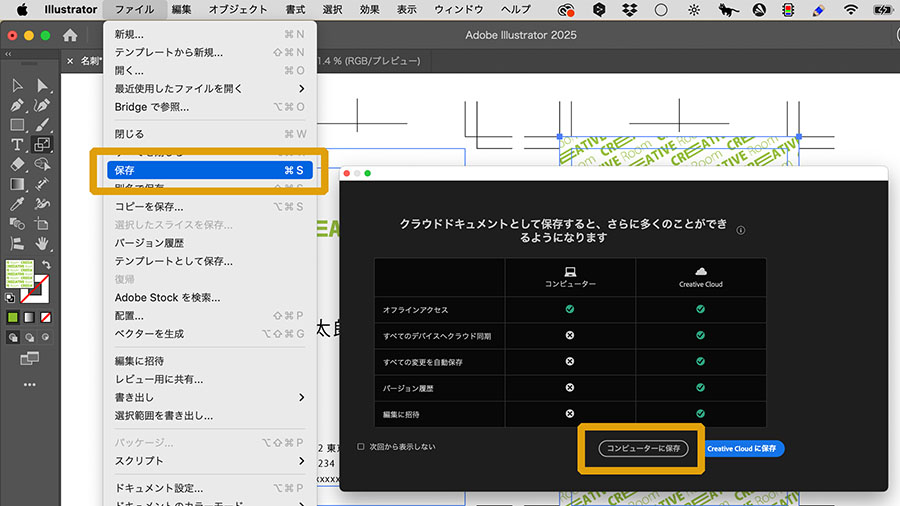 名刺データが完成したら、必ずアウトライン化前の状態で保存しておきます。メニューから ファイル/保存 を選択し、「 コンピューターに保存 」をクリックします。