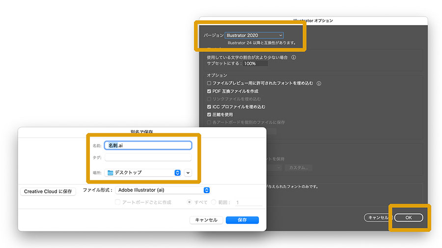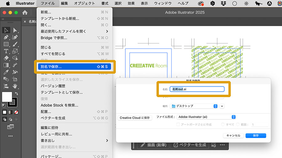 別名で保存 ダイアログボックスで保存場所をデスクトップにし、ファイル名は「名刺.ai」に設定して保存します。