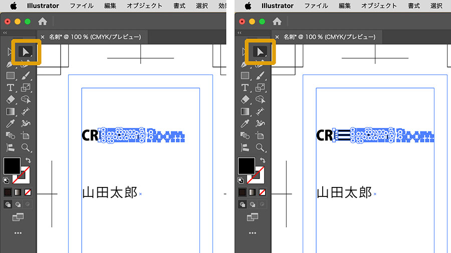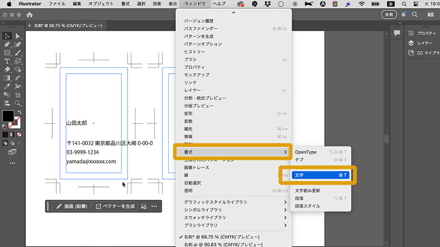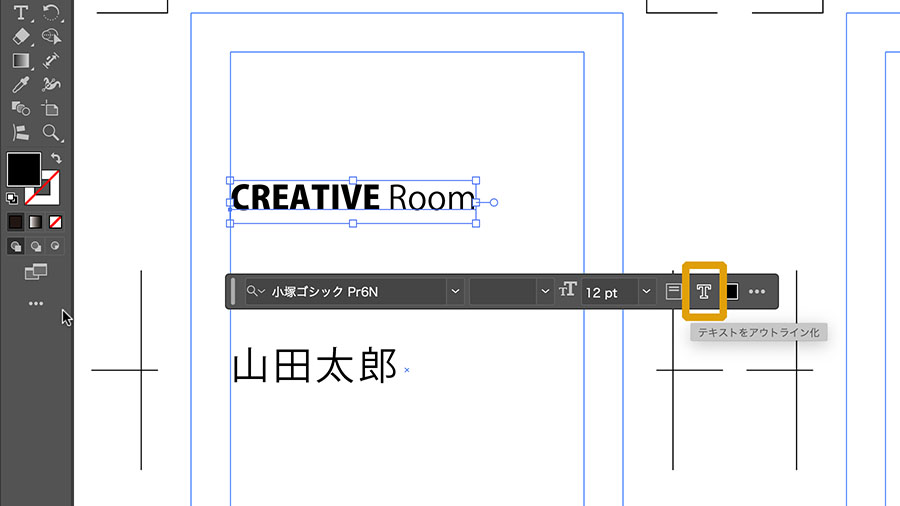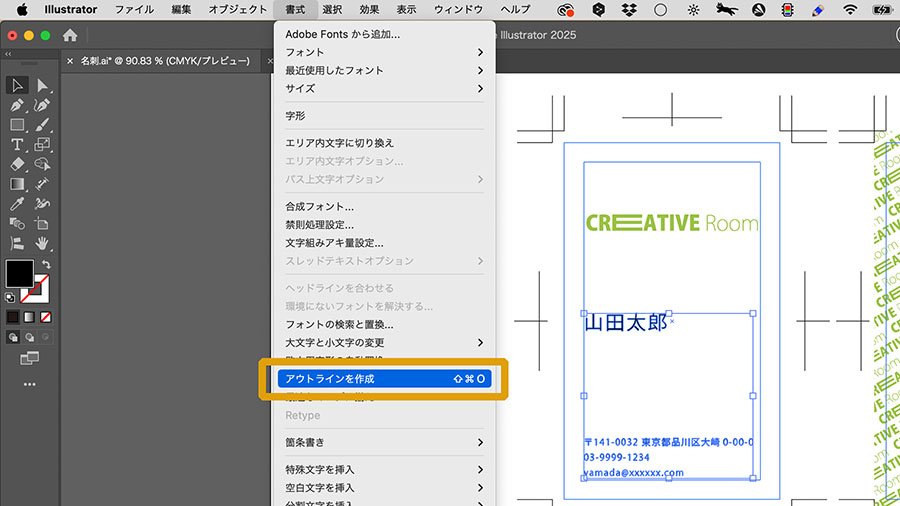 印刷所に入稿する前に、すべての文字をアウトライン化します。 選択 ツールで氏名をクリックし、Shiftキーを押しながら住所や連絡先も選びます。メニューから 書式/アウトラインを作成 を選択すると、文字が図形(パスオブジェクト)に変換されます。