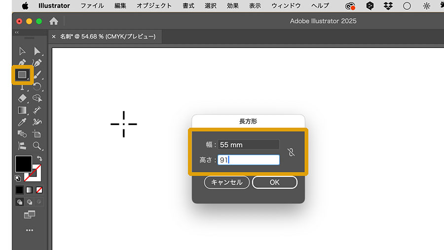 長方形 ツールを選び、アートボード上の任意の位置をクリックします。 長方形 ダイアログボックスが表示されますので、「 」を「55mm」、「 高さ 」を「91mm」に設定して「 OK 」をクリックします。