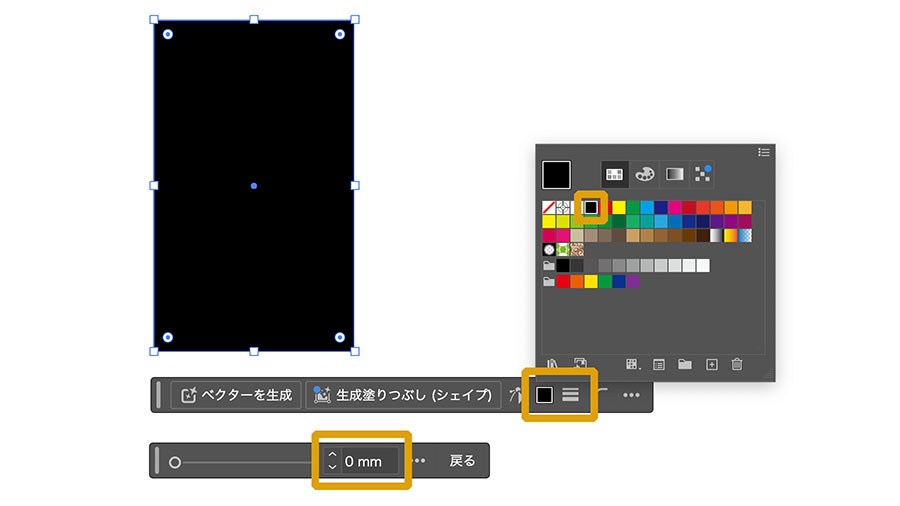 コンテキストタスクバー の「 塗り 」を「ブラック」、「 」を「0mm」に設定し「 戻る 」をクリックします。これで一般的な縦型名刺サイズの長方形が描けます。