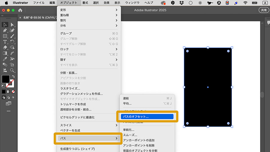 まず、名刺の内側にガイドラインを作るため、長方形を選択し、メニューから オブジェクト/パス/パスのオフセット を選択します。