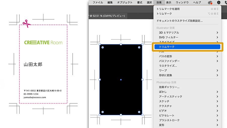 次に、最初に作成した長方形を選択し、メニューから 効果/トリムマーク を選択します。これで裁断位置を示すマークが表示されます。