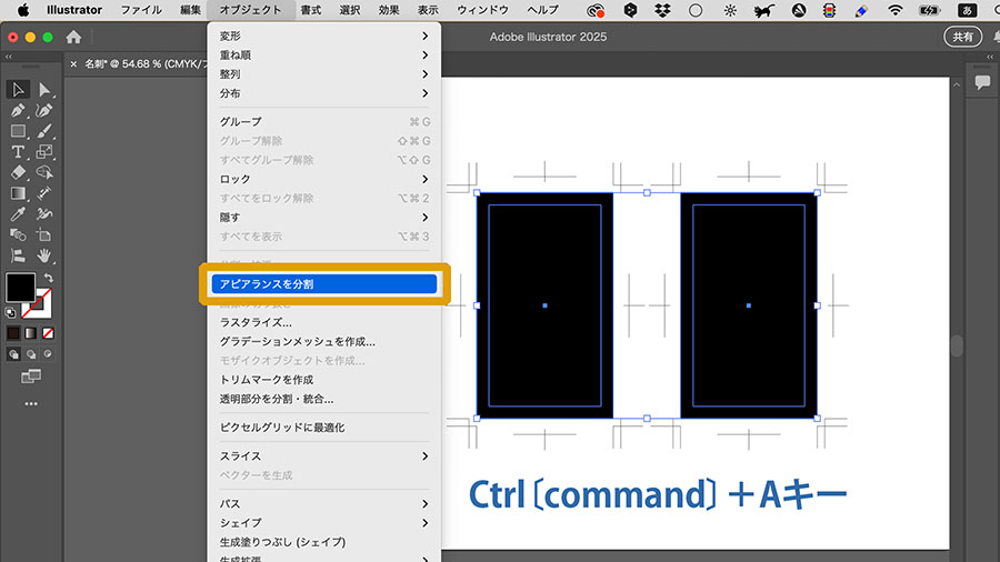 続いてCtrl〔command〕+Aで全てを選択し、メニューから オブジェクト/アピアランスを分割 を選択します。