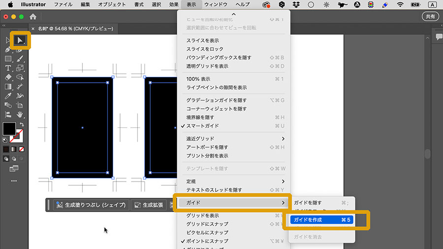 ここで ダイレクト選択 ツールに切り替え、トリムマーク以外の長方形を選びます。メニューから 表示/ガイド/ガイドを作成 を選択します。