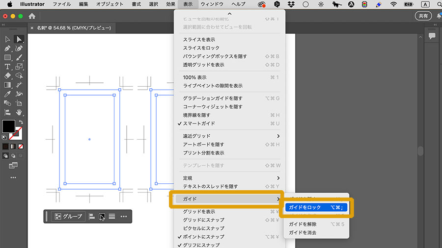ガイドも同様に、「表示」メニュー→「ガイド」→「ガイドをロック」を選択して固定します。