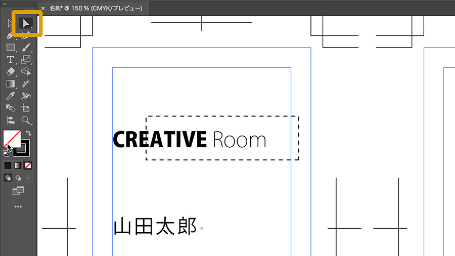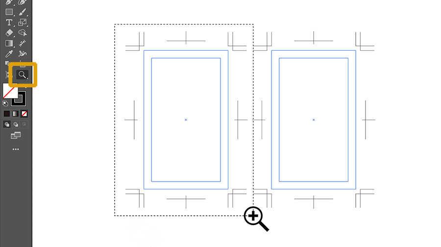 名刺に文字情報を入力します。まずは作業しやすいように、表示を拡大します。 ズーム ツールを選び、左側のトリムマークを囲むようにドラッグすると、その範囲が拡大されます。