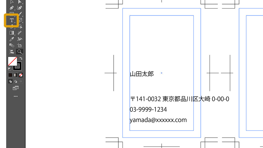 続いて 文字 ツールを選択し、図の位置でクリックして氏名を入力します。入力が終わったら、Ctrl〔command〕キーを押しながら画面の空白部分をクリックするか、Escキーを押して確定します。次に別の位置をクリックし、住所・電話番号・メールアドレスを入力します。すべての文字を入力できたら、 選択 ツールに切り替えて入力作業を終了します。