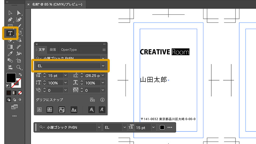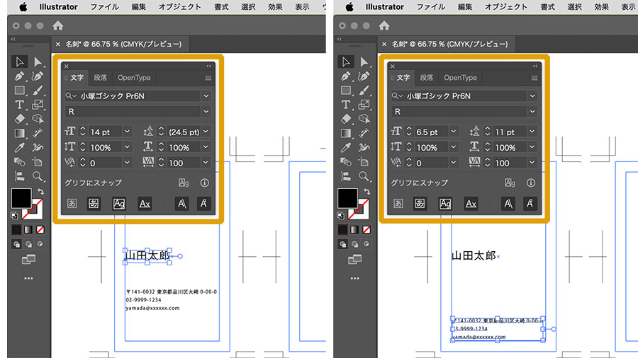 氏名は読みやすく目立つよう、フォントファミリを「小塚ゴシック Pr6N」、スタイルは「R(Regular)」、フォントサイズは「14pt」、トラッキングは「100」に設定します。住所や連絡先は同じフォントファミリ・スタイルで統一し、サイズは「6.5pt」、行送りを「11pt」、トラッキングを「100」に設定します。